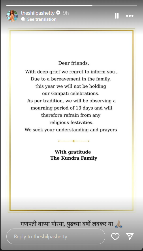 शिल्पा शेट्टी ने अपने आधिकारिक इंस्टाग्राम अकाउंट पर एक भावनात्मक पोस्ट साझा करते हुए बताया कि उनके परिवार में एक सदस्य का निधन हो गया है. इसी कारण इस साल वे गणेश चतुर्थी का पर्व नहीं मना पाएंगी. पोस्ट में उन्होंने लिखा, गहरे दुख के साथ, हमें आपको सूचित करते हुए खेद है कि परिवार में शोक की वजह से इस साल हम अपने गणपति समारोह को आयोजित नहीं कर पाएंगे.
